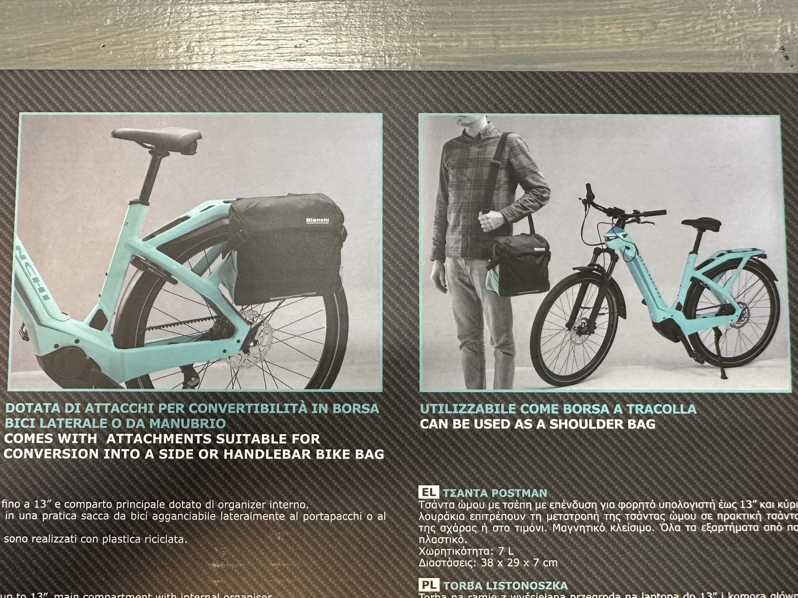 Dankzij de geintegreerde riemen kan de schoudertas in een praktische fietstas veranderen die aan de bagagedrager en stuur kan worden bevestigd.
